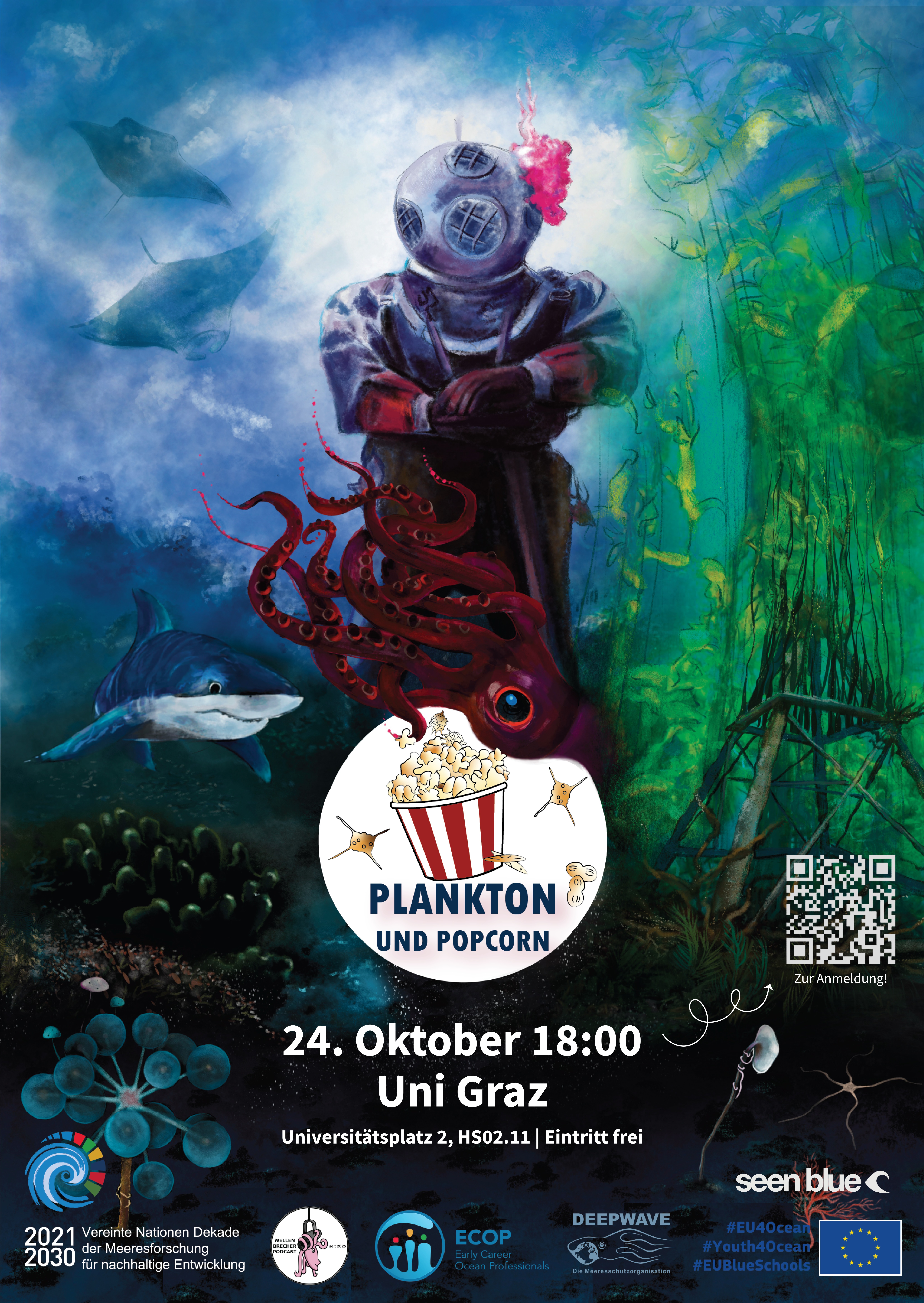 Plankton & Popcorn wurde vom Team des Wellenbrecher Podcasts und den Early Career Ocean Professionals DACH ins Leben gerufen. Sie glauben daran, dass auch Binnenländer wie Österreich, Deutschland und die Schweiz Wellen schlagen können – für einen gesünderen, nachhaltigeren Ozean.
